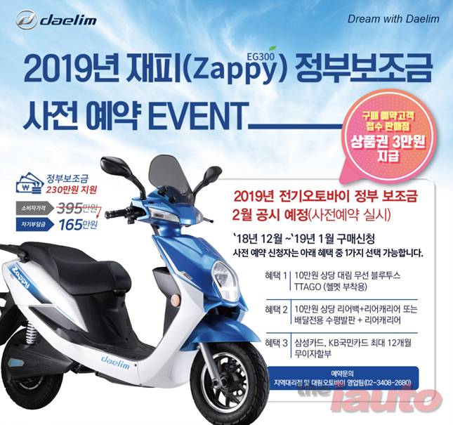 대림오토바이는 2월 초 공시가 예정되어 있는 정부보조금 발표 이전인 1월까지 구매신청을 한 고객들에 한해 10만원 상당의 할인, 헬멧 부착 식 대림 무선 블루투스 TTAGO 제공, 리어백과 캐리어 증정, 수평발판과 캐리어 증정, 카드사 12개월 무이자 할부 등의 3가지 혜택 중 하나를 선택해 지원하는 사전예약 이벤트를 진행한다.