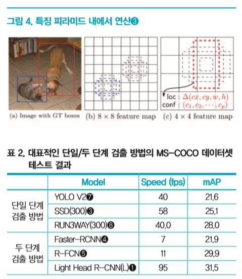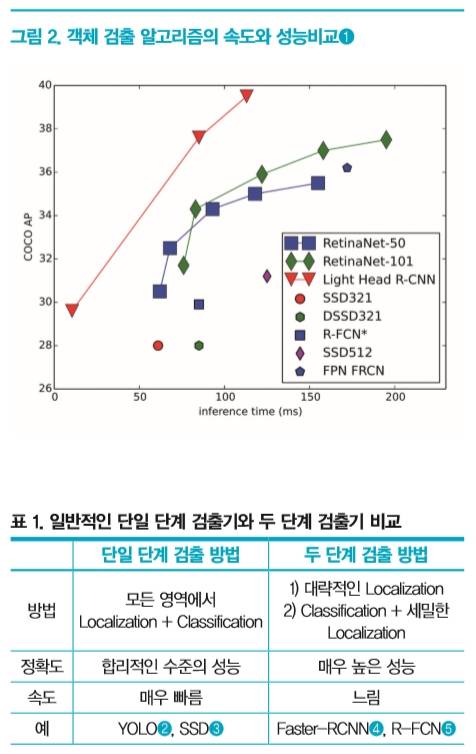 두 단계 검출기는 최근까지도 성능은 뛰어나지만 속도가 오래 걸린다는 단점을 가지고 있었다. <표 2>를 살펴보면, Faster-RCNN 또는 R-FCN의 경우 15fps도 되지 않는 것을 볼 수 있다. 하지만, 최근 발표된 Light Head R-CNN이라는 논문❶은 최근 매우 뛰어난 정확도와 속도를 나타냄을 보여주었다. 현재까지 나온 객체 검출 알고리즘도 매우 성능이 좋고 빠른 알고리즘이 많지만, 현실에 적용하기 위해서는 아직 부족한 부분이 많다. 정확도 측면에서 살펴본다면, 정확도를 나타내는 mAP의 최고 값은 1이다. 하지만, 현재 MS-COCO 데이터 셋에서의 mAP는 20~30 정도 수준으로 더욱 높은 성능을 요구한다. 속도적인 측면에서 살펴보면, GPU가 포함된 PC 환경에서의 속도가 100fps이나 실제 임베디드에 적용하기 위해서는 더욱 빠른 알고리즘을 필요로 한다. 아직까지도 객체 검출 알고리즘을 실제로 적용하기 위해서는 많은 기술 연구 및 개발을 필요로 하고, 계속 연구들이 진행되고 있다.
