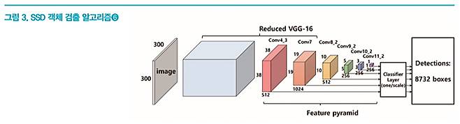 단일 단계 검출기는 앞에서 언급한 것과 같이 모든 영역에서 객체의 위치 검출과 분류를 동시에 수행한다. 이를 동시에 수행하다보니, 속도는 빠르지만, 정확도는 두 단계 검출 방법보다 조금 떨어지는 단점이 존재한다. 대표적인 알고리즘으로 YOLO, SSD 등이 있다. <그림 3>❻은 단일 단계 검출기에서 가장 많이 사용되는 SSD❸의 알고리즘을 나타내는 그림이다. <그림 3>을 살펴보면 처음 RGB 채널의 이미지가 입력으로 들어가게 된다. 이후 Deep Neural Netwrok(DNN) 연산을 수행하여 특징 피라미드(Feature Pyramid)를 만들게 된다. 이 특징 피라미드는 각 객체의 크기에 따른 특징 정보를 가지고 있고, 피라미드에서의 38, 19, 10, 5, 3, 1 의 숫자는 Grid를 나타낸다. 즉 빨간 부분에서는 38×38로 나누어 각 부분에서 객체가 있는지를 살펴보게 된다. 빨간 부분은 이미지 내에서 작은 객체에 대한 정보를 가지고 있고, 보라색 부분은 이미지 내에서 가장 큰 객체에 대한 정보를 가지고 있다.
