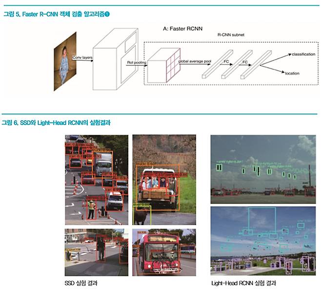 두 단계 검출기는 대략적인 객체의 위치를 검출한 후, 검출된 후보군의 분류와 세밀한 객체의 위치 검출을 수행한다. 대표적인 알고리즘으로 Faster- RCNN, Light-Header R-CNN 등이 있다. <그림 5>❶는 두 단계 검출기에서 가장 많이 사용되는 Faster R-CNN의 알고리즘을 나타내는 그림이다. 그림을 살펴보면 처음 RGB 채널의 이미지가 들어가게 되고, DNN 연산을 수행하여 객체가 있을 만한 위치에 대한 후보군(Region of Interest)들을 찾아낸다(대략적인 Localization). 이후, 후보군들 각각에 대하여 Classification을 수행하고, 후보군 내에서 더욱 정확한 위치에 대한 연산을 수행한다.