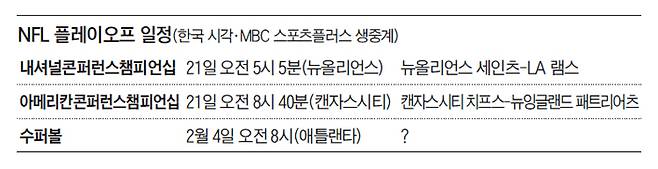 NFL(미 프로풋볼리그) 챔피언을 향한 여정에 이제 네 팀만 남았다. 21일 뉴올리언스 세인츠와 LA램스(내셔널콘퍼런스), 캔자스시티 치프스와 뉴잉글랜드 패트리어츠(아메리칸콘퍼런스)가 양대 콘퍼런스 승자를 가린다. 이 대결에서 살아남은 두 팀이 최종 챔피언 자리를 놓고 2월 4일 수퍼볼에서 맞붙는다.