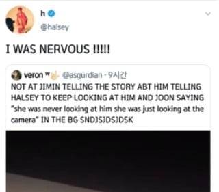 이어 할시와의 일화에 대해 지민이 함께 춤추는 장면에서 "look at me. look at me"라고 자신을 보라고 했는데 끝내 보지 않았다고 말해 웃음을 자아냈다.