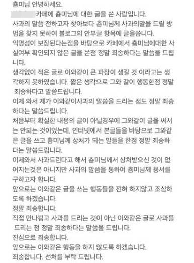 해당 누리꾼은 "XXX 카페에 춈미님에 대한 글을 쓴 사람"이라며 "익명성이 보장된다는 점을 바탕으로 카페에서 춈미님에 대한 사실여부 확인되지 않은 글을 쓴 점 죄송하다는 말씀을 드린다. 생각없이 적은 글로 이처럼 큰 파장이 생길 것이라고는 생각하지 못했다. 짧은 생각으로 그와 같이 행동한 점 정말 죄송하다고 말씀드린다"고 전했다.