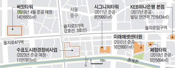 9일 오후 서울 지하철 을지로4가역 9번 출구를 나서자 외부 마무리 공사가 한창인 쌍둥이 오피스 빌딩이 눈에 들어왔다. 이 건물은 작은 인쇄소 등이 밀집한 골목을 재개발해 2016년부터 짓고 있는 '써밋타워'다. 4월 준공을 앞둔 이 건물은 지하 8층~지상 20층의 2개 동 규모로, 건물 연면적만 14만㎡가 넘는다. 이곳에서 멀지 않은 시그니처타워(9만9991㎡)보다는 크고 미래에셋센터원(16만8001㎡)보다는 작다. 써밋타워에는 건물 시공사인 대우건설을 포함해 비씨카드 등 기업이 이전, 입주할 예정이다. 대우건설 관계자는 "세운재정비촉진지구 내에서 처음으로 완성된 오피스 사례"라며 "대기업들이 속속 이사를 해오면 낙후된 을지로 3, 4가 일대 거리 풍경이 크게 달라질 것"이라고 말했다.
