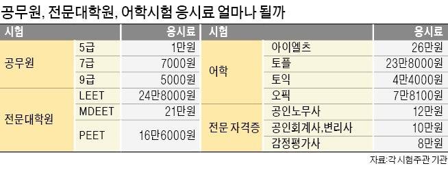 한국경제신문이 비교적 수험생들이 많이 몰리는 30개 공무원·자격증·전문시험 등의 응시료를 조사했다. 수험생이 납부한 응시료는 ‘수급자 부담’ 원칙에 따라 문제 출제, 고사장 섭외 등에 사용된다. 한 전문대학원 관계자는 “전문 대학원 응시료는 수익 사업이 아니기에 응시 인원이 많으면 낮춰질 가능성이 높다”고 말했다.