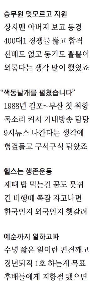 ▷1기 승무원 중 남아 있는 여자 승무원은 내가 유일하다. 남자 승무원은 7명이 남았다. 우리는 처음 시작할 때부터 선배가 없었다. 동기들과 같은 비행기를 탄 적도 많지 않았다. 그래서 외롭다는 생각을 많이 한 것 같다. 2기 중에도 남아 있는 여자 승무원은 한 명밖에 되지 않는다.