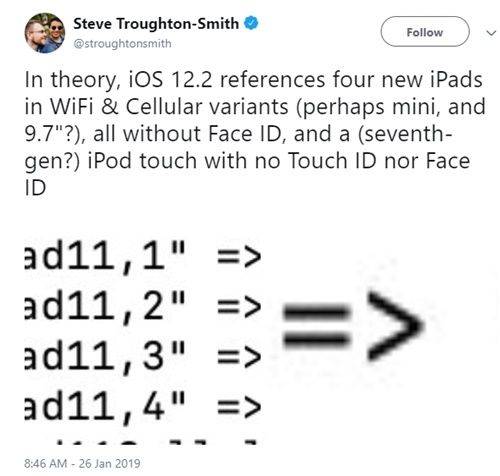 iOS 개발자 스티브 트로턴-스미스(Steven Troughton-Smith)는 iOS 12.2 베타버전 소스 코드에서 아이패드 11,1~11,4에 이르는 4개의 아이패드 모델명을 발견했다고 트위터를 통해 밝혔다.