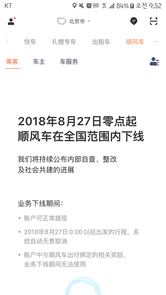 원래 디디추싱은 카풀서비스인 '순펑처(顺风车)'를 운영했다. 그러나 지난 해 승객 및 기사 피살사건이 이어지면서 무기한 서비스 중단을 선언한 바가 있다. 2018년 5월 허난(河南)성 정저우(鄭州)에서 서비스를 이용하던 20대 여성이 운전기사에게 성폭행을 당한 후 살해된데 이어 8월 저장(浙江)성 원저우(溫州)에서도 20대 여성이 살해되는 사건이 일어났다.