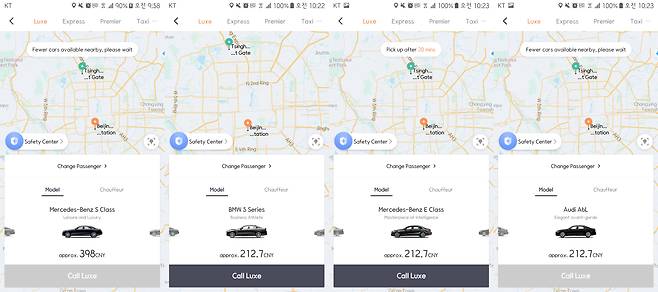 지불수단까지 등록을 마치면 승차 위치와 도착지를 설정한다. 승차 위치는 GPS를 통해 자동으로 설정된다. 정확하지 않거나 현재 위치와 다른 곳에서 승차를 원하는 경우 직접 설정할 수도 있다. 승∙하차 지점을 설정했으면 원하는 서비스를 선택한다. 영어버전으로 들어가면 4가지 서비스 중 선택할 수 있다. Taxi는 호출 부근의 택시를 불러주는 우리나라 카카오택시와 동일한 서비스이다. 요금이 정해져 있지 않고 미터기에 나오는 요금에 따라 계산하면 된다. 현금결제도 되고 위챗페이나 알리페이도 가능하지만 우리나라처럼 신용카드로 직접 계산하는 것은 불가능하다. 택시 이외에는 Express, Premier, Luxe가 있는데 모두 개인 소유 차량으로 이동 서비스를 제공한다. Express는 중국어로 콰이처(快车) 서비스로 부르는데 가장 일반적인 차량이다. 탑승 날짜와 시간을 설정할 수 있으며 Express와 Select 중에서 선택할 수 있다. 전자가 기본형이라면 후자는 좀 더 업그레이드된 차량이다. Premier는 말 그대로 프리미엄 서비스다. 한 등급 위의 좋은 차량이 제공되거나 6인승 밴을 이용할 수 있다. Comport, Business Van, Luxury의 세 종류 중 원하는 차량을 고르면 된다. Luxe는 럭셔리 브랜드 차량이 제공되는 서비스다. 랜덤 선택을 할 수도 있고 본인이 원하는 차량으로 선택할 수도 있다. 예를 들어 벤츠 S클래스, BMW 5시리즈, 벤츠 E클래스, 아우디 A6L 등의 차량이 제공된다.