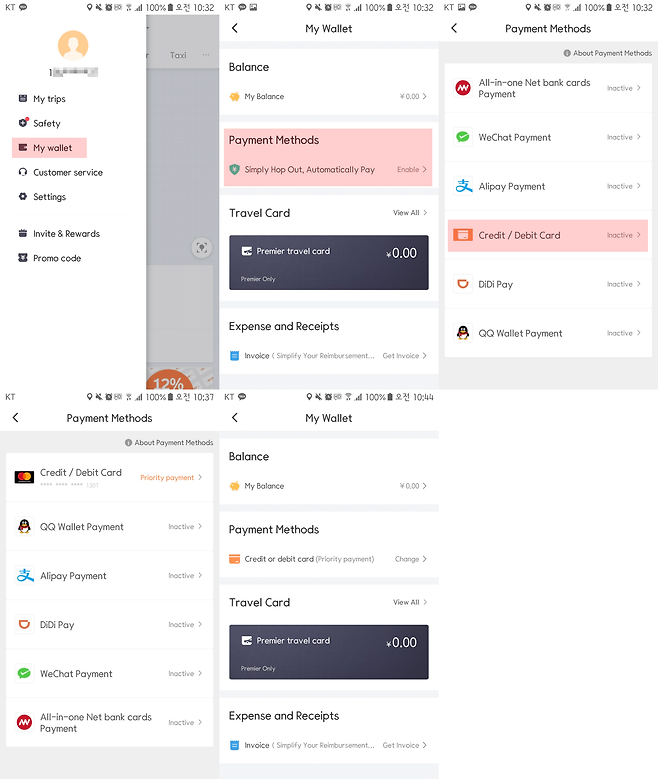 결제는 어플에 미리 등록한 카드로 하차 시 자동결제가 가능하다. 택시는 현금이나 위챗페이, 알리페이 등으로 직접 결제를 할 수 있다. 그러나 기타 서비스의 경우 기사에 따라 현금결제가 안되는 경우도 있으니 사용가능한 카드를 미리 등록해두는 것이 좋다. My wallet 탭을 누르면 결제방식을 선택할 수 있다. 총 6가지의 결제방식을 제공하는데 중국의 위챗, 알리페이가 없는 경우에는 해외결제가 가능한 비자나 마스터카드 등을 등록해야 한다(은행사, 카드사별로 가능한 카드가 다르니 유의).