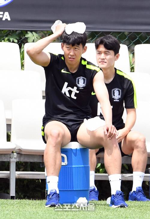 축구대표팀의 손흥민이 8일 부산 강서체육공원에서 진행된 회복 훈련 및 오픈 트레이닝데이 행사에서 스트레칭을 마친 뒤 얼음주머니를 머리에 대고 더위를 식히고 있다.