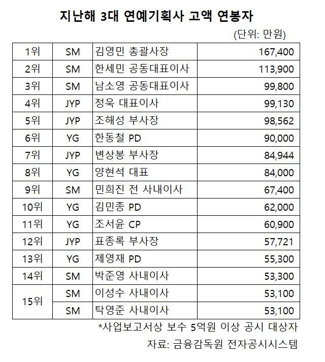 지난해 '빅3'(SMㆍYGㆍJYP) 연예기획사 중 '연봉킹' 자리는 16억원 넘는 보수를 받은 SM엔터테인먼트의 김영민 총괄사장에게 돌아갔다.