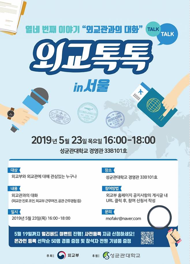13일 외교부에 따르면 오는 23일 오후 4시 성균관대학교 경영관 33B101호에서 '제14회 외교관과의 대화-외교톡톡 in 서울'이 개최된다.