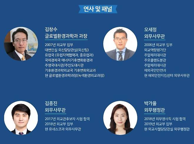 특히 지난해 입부한 김종진 사무관은 외교관 후보자 시험에 대해, 올해 입부한 박가을 행정관은 외무영사직 시험에 대한 노하우를 알려줄 계획이다. 4명의 강연자는 사전 등록에서 접수한 참석자들의 주요 질문에 답변하는 시간도 갖는다.
