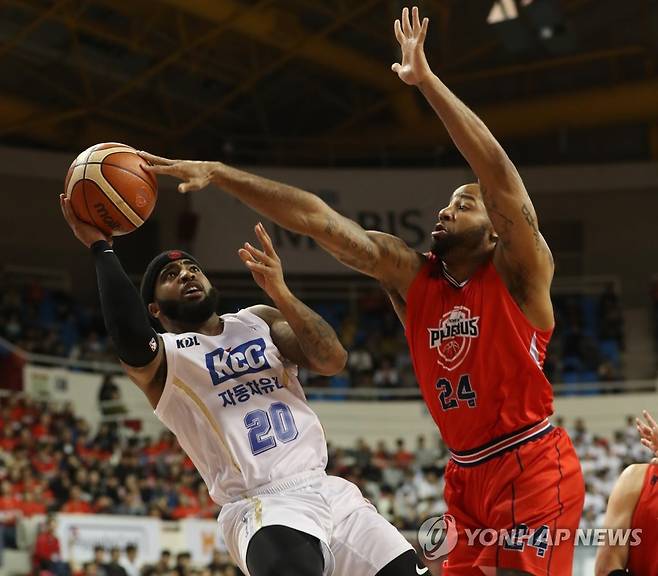 (울산=연합뉴스) 김용태 기자 = 5일 오후 울산 동천체육관에서 열린 2018-2019 SKT 5GX 프로농구 4강 플레이오프 울산 현대모비스와 전주 KCC의 2차전 경기. KCC 마커스 킨이 현대모비스 쇼터의 수비를 피해 슛하고 있다. 2019.4.5