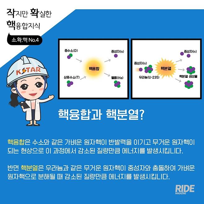 수소폭탄을 언급하기 전에, 폭탄의 원리인 핵융합에 대해서 잠깐 짚고 넘어가자. 수소는 우주에서 가장 흔히 볼 수 있는 원소이다. 가장 작고 가벼우며, 다른 원소의 기본이 되는 물질이다. 태양과 비슷한 가장 기본적인 별(항성恒星)은 그 내부에서 수소가 합쳐져 헬륨으로 바뀌며 연쇄적으로 빛과 열을 낸다. 이때 원소 내부의 원자핵이 합쳐지는 현상을 핵융합(核融合)이라 한다. 핵융합이 일어나는 내부는 태양의 엄청난 질량 때문에 압력은 1천억 기압, 온도는 천오백만도 이상이다. 태양보다 8배 이하로 큰 별은 헬륨을 원료로 핵융합을 하게 된다. 여기서 탄소와 산소가 생긴다. 10배 이하인 별은 네온, 마그네슘으로 핵융합이 이루어진다. 태양보다 10배이상인 별은 최종적으로 철까지 핵융합하게 된다. 그 외에 원소주기율표에 나오는 나머지 물질들은 이 별이 초신성으로 폭발할 때 높은 온도와 압력으로 합성된다.