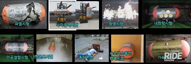 수소저장용기는 안전장치가 잘 동작하는지 확인하기 위해, 직접적인 충격과 고온/고압 환경, 차량 충돌사고 등 여러 가지 상황으로 테스트를 거친다. 낙하시험은 운송 중 낙하에 의한 충격손상을 시험한다. 또 예리한 칼날 손상에 따른 복합재 결함 내구시험을 1만 2,000회씩 거쳤다. 수소저장용기를 총으로 쐈을 때 폭발이나 화재가 발생하는지 확인하는 관통시험도 진행했다. 또 몇 번을 충전하더라도 수소저장용기와 주입구가 잘 버티는 지 테스트 하는 극한 반복가압시험 등 14개 항목을 테스트해 수소저장용기가 직접적인 충격 전달로부터 안전함을 확인했다. 화염시험에서는 화재 시 수소저장용기의 파열 없이 수소를 배출하는 지 테스트한다. 온도가 올라가면 내부 압력이 증가해 용기가 버틸 수 있는 한계를 초과하게 된다. 차량 화재로 주변이 일정 온도가 넘어가면, 수소저장용기는 안전을 위해 자동으로 수소를 방출한다. 내부 압력을 낮춰서 폭발을 방지하는 것이다. 배출되는 수소에 불이 붙더라도 길쭉한 불꽃만 발생할 뿐 화재로 커지지는 않는다.