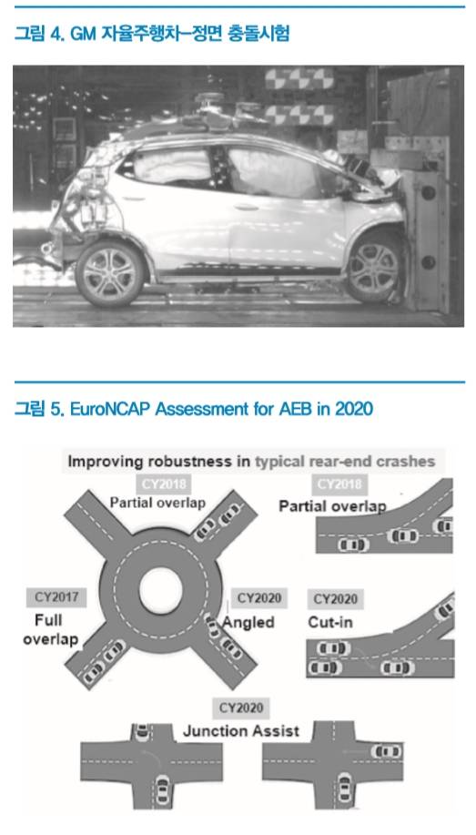 하지만 자율주행차는 상당 기간은 사람이 운전하는 차량과 같은 도로를 달려야 하므로 충돌사고의 위험을 완전히 피하기는 어렵다. 따라서 이러한 위험이 모두 사라지기 전까지는 자율주행차에도 현재와 같은 신차 충돌 안전도 평가에서 시행하는 충돌 안전성에 대한 요구조건을 만족하여야 할 것이다<그림 4>.