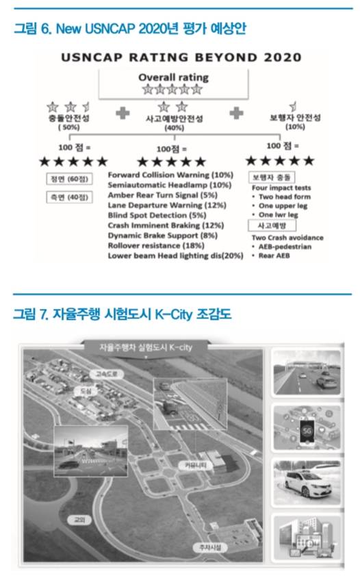 한국 정부는 교통사고 사망자 수를 보다 감소시키기 위해 2017년부터 능동안전 장치의 장착을 촉진하고자 장착에 대한 배점과 기능 평가를 강화하고 있다. 그리고 자율주행차의 상용화에 대비하여 자동차안전연구원은 2018년 말 완공을 목표로 K-City를 건설중이며 자율주행차를 위한 교차로 충돌, V2X, 사이버공격 대비 및 제어권 전환 등 실제 도로에서 발행할 수 있는 사고 환경을 고려한 자율주행 기술의 평가 시나리오를 대학교, 연구기관, 자동차 제작사와 함께 개발하고 있다<그림 7>.
