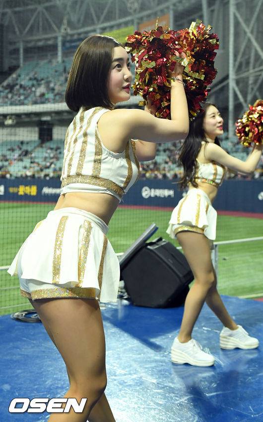 [OSEN=고척, 민경훈 기자] 31일 오후 서울 고척스카이돔에서 열린 ’2018 신한은행 MY CAR KBO리그' 키움 히어로즈와 SK 와이번스의 경기, 키움 이엄지 치어리더가 응원단 단상 위에서 화려한 공연을 펼치고 있다. /rumi@osen.co.kr