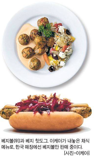 이 지향점을 밑바탕에 두고 이케아는 실험적으로 베지볼, 베지 핫도그, 연어볼을 선보였다. 베지볼과 베지 핫도그는 고기를 전혀 넣지 않은 채식 메뉴다. 대신 케일, 렌틸콩, 당근 같은 식물성 재료를 두루 섞어 맛을 낸다.