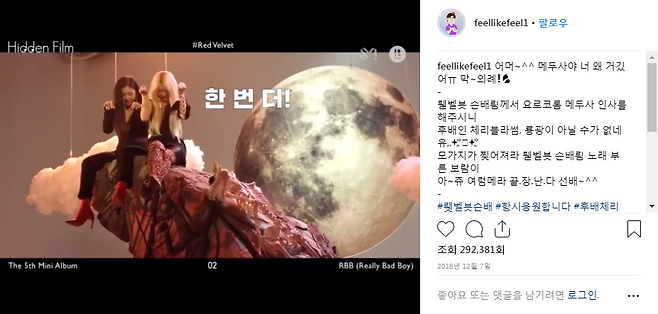 정말 신기하고 얼떨떨했어요. 실감이 나지 않는 느낌? 영상 속 저와 실제 저를 분리해서 생각하는 경향이 있어서 그런지 '레드벨벳이 나를 따라하는구나'라는 생각보단 '레드벨벳이 메두사 인사를 하는구나' 싶었죠.