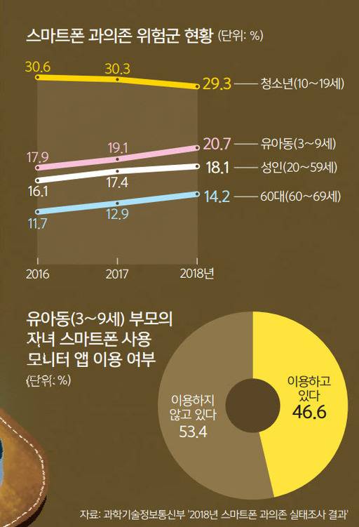 스마트폰 과의존이란 스마트폰 이용량이 많은 데다 스스로 조절이 어려워 신체·심리·사회적으로 부정적 결과를 경험하는 현상을 뜻한다. 청소년 중 스마트폰 과의존 위험군 비율은 29.3%였고, 3∼9세 유아동은 20.7%가 이 위험군에 속했다. 20∼59세 성인 중 비율은 18.1%, 60∼69세는 14.2%였다. 과기부의 ‘2017 인터넷이용실태조사’ 결과에 따르면 10대의 스마트폰 이용률은 97.2%, 유아동은 63.8%였다.