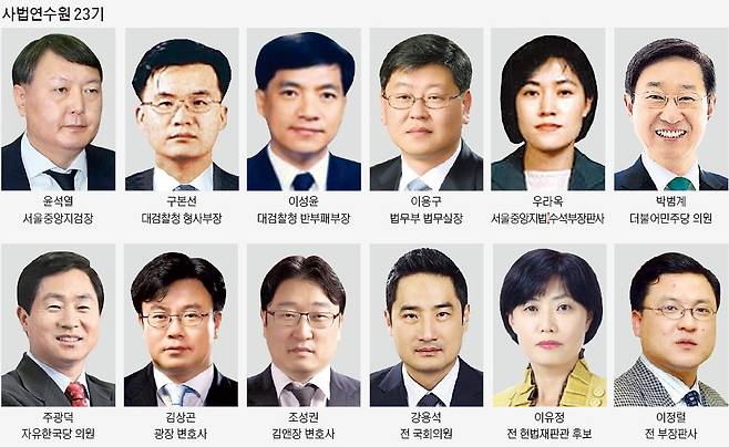 그 후로 25년. 법조계에서는 연수원 23기가 지난 사반세기 동안 ‘대하드라마를 찍었다’는 우스갯소리까지 나온다. 한직을 맴돌다 ‘적폐청산 선봉장’으로 돌아온 윤석열 서울중앙지검장, ‘박근혜 대통령의 여자’로 불린 조윤선 전 문화체육관광부 장관, 노무현 전 대통령에게 “이쯤 되면 막 하자는 거죠”라는 소리를 들었던 김영종 전 검사, 연예인급 인지도를 바탕으로 각종 화제를 몰고 다녔던 강용석 변호사 등이 모두 23기다.