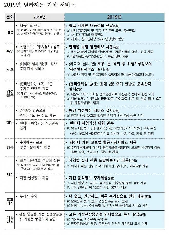우선 올해 국민 안전과 관련된 태풍과 집중호우, 폭염과 같은 위험기상 정보를 강화하기로 했다. 강풍이 실제 나타나는 영역과 태풍 위험영역, 최근접 거리, 이동 속도, 강도 변화 등 부가정보를 제공하고 24시간 간격으로 발표하던 태풍 예상 진로를 12시간 간격으로 발표하기로 했다. 우리동네 레이더 날씨 알리미앱(응용프로그램)을 통해 사용자 위치를 기준으로 10분마다 최대 2시간 뒤까지 호우와 눈, 낙뢰 등 위험기상을 알리는 서비스를 제공하기로 했다.
