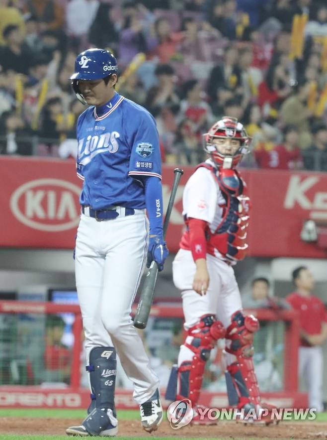 (광주=연합뉴스) 천정인 기자 = 30일 오후 광주-KIA챔피언스필드에서 열린 '2019 프로야구' 삼성 라이온즈와 KIA 타이거즈 경기 8회초 1사 1, 2루 상황에서 삼성 구자옥이 삼진 아웃되고 아쉬워하고 있다. 2019.4.30