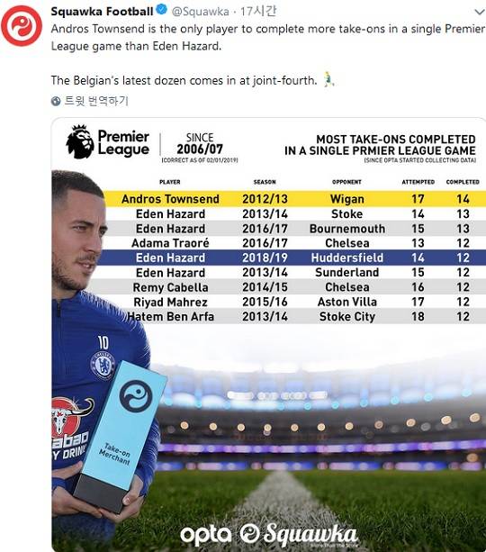 이 경기의 영웅은 단연 아자르이다. 그는 무려 14회의 드리블 돌파를 시도해 12회를 성공시키며 이번 시즌 EPL 전체 한 경기 최다 드리블 돌파를 달성했다. 유럽 축구 통계 업체 'OPTA'가 데이터를 수집한 2006/07 시즌 이래로 EPL 역사를 통틀어 보더라도 공동 4위에 해당하는 대기록이다(흥미로운 점은 공동 2위가 아자르로 2013/14 시즌 스토크 시티전과 2016/17 시즌 본머스전에 드리블 돌파 13회를 기록한 적이 있다. 참고로 1위는 안드로스 타운센드로 2012/13 시즌 위건전 14회이다). 말 그대로 드리블 돌파를 통해 허더스필드 수비진을 파괴했다고 할 수 있겠다.