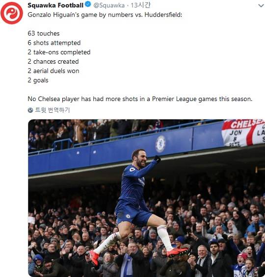 첼시, 허더스필드전 5-0 대승. 이과인과 아자르 사이좋게 멀티골. 아자르와 이과인, 서로에게 가장 많은 패스 제공하며 찰떡궁합(아자르 -> 이과인 12회, 이과인 -> 아자르 9회)
