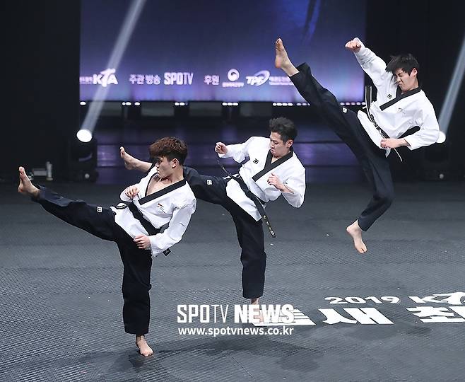 [스포티비뉴스=서울, 곽혜미 기자] 2019 KTA 품새 최강전이 9일 오후 서울 송파구 올림픽공원 K아트홀에서 열렸다. 태권한류 한영운, 류현식, 권영인이 경기를 펼치고 있다.