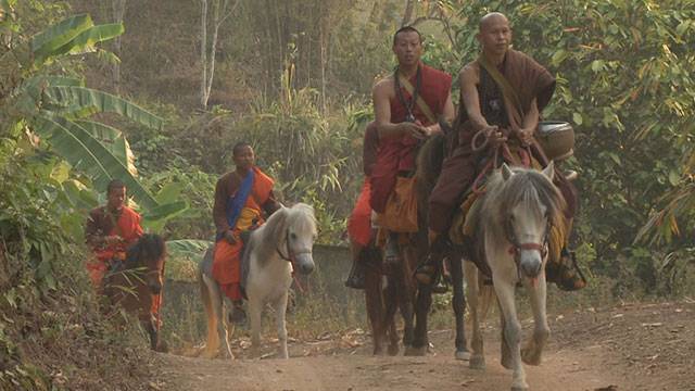 새벽에 일어나 승복을 입고 공양 음식을 담을 발우를 챙기면 모두 말을 타고 사찰 앞마당에 모인다. 그리고 선임 승려의 인도에 따라 불경을 외치고 말을 타고 탁발을 나간다. 이들이 탁발을 나가는 마을은 '골든 트라이앵글'의 산악 지역에 있는 태국 소수민족 마을들이다. 이 사찰의 15개 분원에 있는 승려들을 포함해 이들이 방문하는 마을을 모두 합치면 100곳이나 된다.