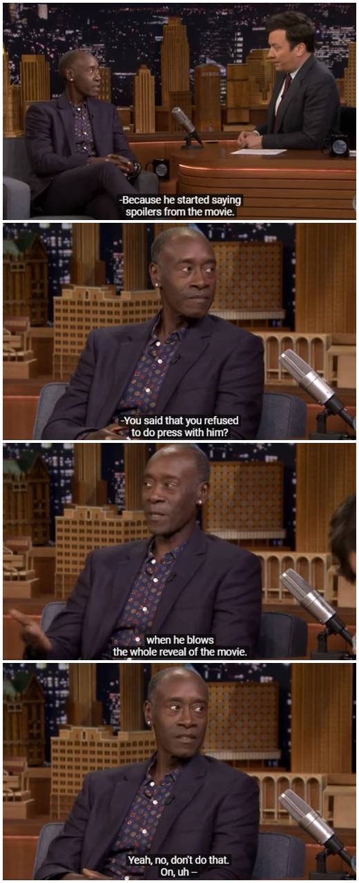 ‘어벤져스’ 시리즈에서 워머신 역을 연기하는 그는 17일(현지시간) 지미 팔론의 ‘투나잇쇼’에 출연해 “나는 마크 러팔로가 영화 전체 이야기를 알려줄 때 옆에 있고 싶지 않다”고 말했다.