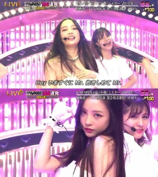 최근 일본 프로덕션 오기와 전속계약을 맺고 일본 활동의 시작을 알리기도 했던 구하라는 이날 방송에서 흰색 의상을 입고 '미스터'를 불렀다.