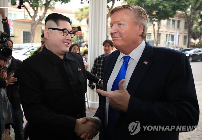 (하노이=연합뉴스) 한종찬 기자 = 제2차 북미 정상회담을 닷새 앞둔 22일(현지시간) 베트남 하노이 소피텔 레전드 메트로폴 하노이 호텔에서 김정은 북한 국무위원장 대역배우인 홍콩 출신 하워드 X와 도널드 트럼프 미국대통령 코스프레를 한 외국인이 악수하고 있다. 2019.2.22