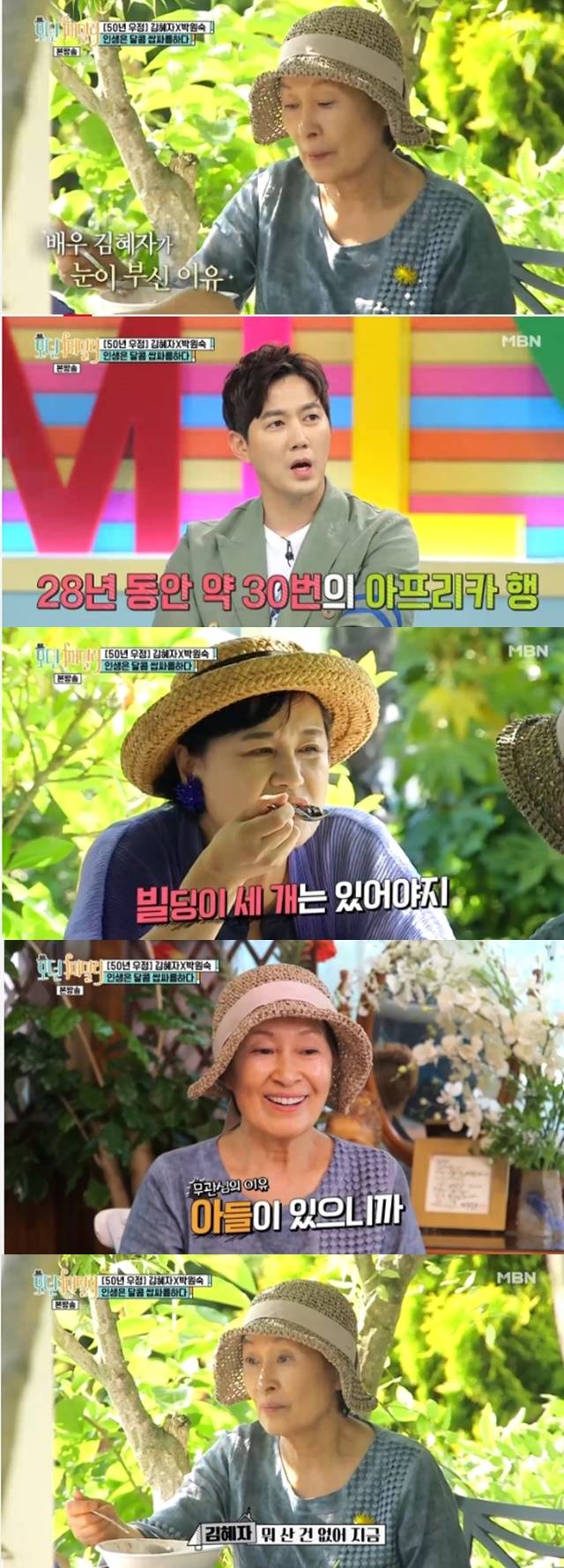박원숙이 “28년간 아프리카 봉사활동을 얼마나 갔냐”고 묻자 김혜자는 “30번 다녀왔다”고 말했다. 박원숙이 “그렇게 봉사활동하고 30년간 CF 찍었으면 빌딩이 3개는 있어야겠다”고 말했고 김혜자는 “아무 것도 산 게 없어”라며 웃었다.
