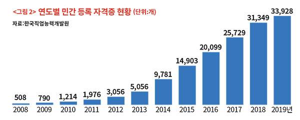 <그림 2>에서 볼 수 있는 것처럼, 2008년 508개에 불과했던 민간 등록 자격증이 2013년부터 매년 급증하고 있다. 2015년부터 2018년까지 매해 신규 자격증이 5000개 이상 생겨나면서 지난해 처음으로 3만 개를 돌파했다. 올 한 해만도 5월9일 현재까지 신설된 자격증이 2579종에 이른다. 이 추세대로라면 내년에는 민간 등록 자격증 4만 개 시대도 가능하다.