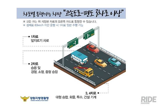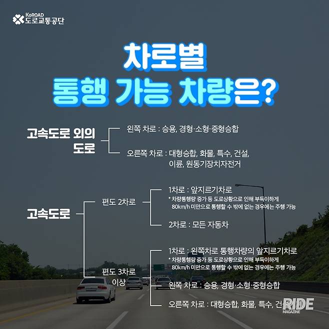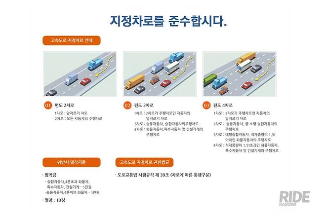 ‘지정차로제는 도로의 효율성을 높이고, 원할한 소통을 위해 정해진 규칙’이라고 되어있다. 쉽게 말해, 느린 차가 좌측 차로를 이용하여 빠른 차의 통행을 막지 않도록 고려한 것이다. 그 빠르고 느린 차에 기준은 차량의 성능, 그리고 차량 제원에 따라 차로별 통행할 수 있는 차종(승용, 승합, 화물, 특수)을 지정했다.