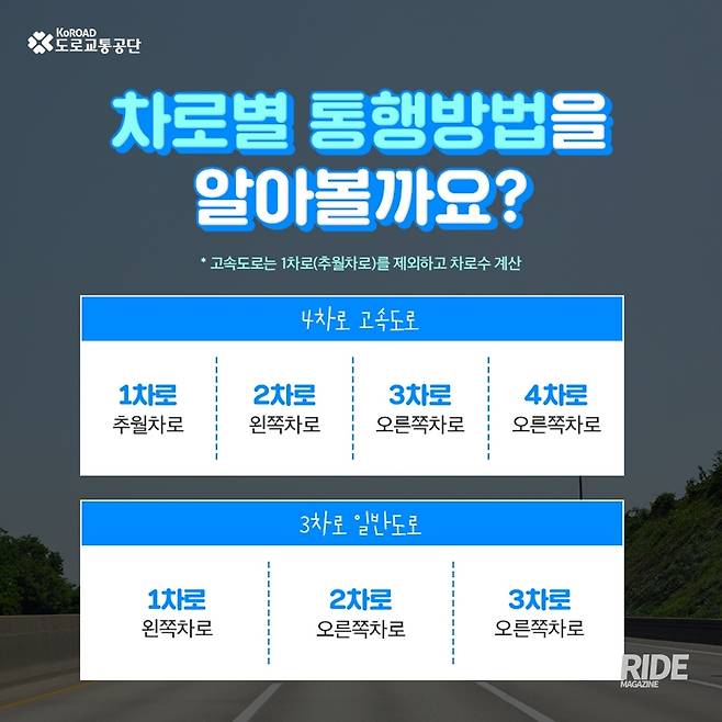 12월 18일 공포된 개정안은 예전처럼 세세하게 차로를 구분하지 않고, 차로를 반으로 나눠 왼쪽, 오른쪽 차로로 구분한다. 홀수 차로의 경우 가운데 차로는 오른쪽 차로로 구분한다. 알다시피, 고속도로에서 1차로는 추월 차로이다. 그래서 추월차로를 뺀 나머치 차로를 가지고 왼쪽 오른쪽을 구분한다. 예를 들어 3차로 고속도로에서 1차로는 추월차로, 나머지 2차로를 반으로 나눠 왼쪽인 2차로가 승용, 중소형 승합차량, 오른쪽인 3차로는 나머지 버스를 비롯한 대형차량의 주행로이다. 2차로 고속도로는 추월차로인 1차로를 빼면 2차로만 남는다. 그래서 2차로인 중앙고속도로에서 모든 차들이 달리는 것이 맞지만, 실상은 옆 트럭과 속도를 맞춰 달리는 승용차로 인해 그 뒤로 1차로에 차가 가득하다. 추월하지 않을 때는 추월차선을 피해 2차로를 달려주면 빠른 차는 먼저 가고, 다른 차들은 서로 속도에 맞춰 훨씬 짧은 시간에 이동할텐데 무척 아쉬웠다.