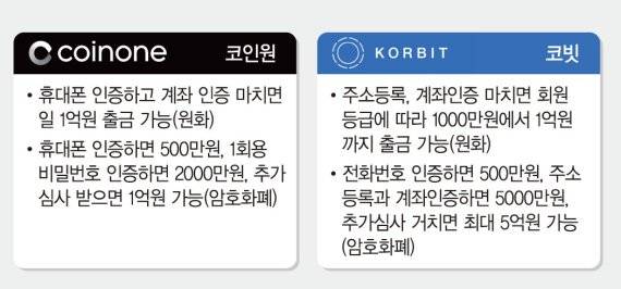 코빗도 전화번호 인증 시 암호화폐 500만원을 출금할 수 있도록 했다. 계좌인증까지 마치면 5000만원까지 한도가 늘어난다. 이보다 많은 금액 출금을 원하면 추가심사를 받아야 한다. 코인원도 계좌인증이 완료된 고객들의 암호화폐 출금을 세단계로 나눠서 관리하고 있다.