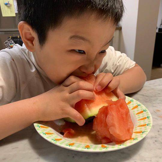 사진 속엔 그의 쌍둥이 둘째 아들 서준이가 수박을 먹고 있다.
