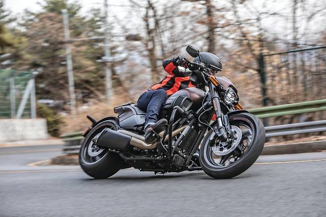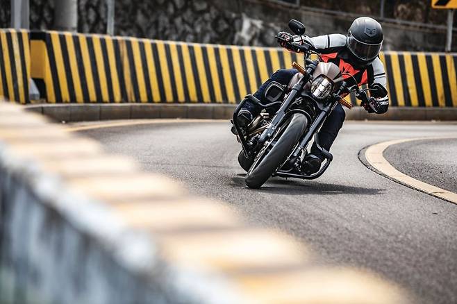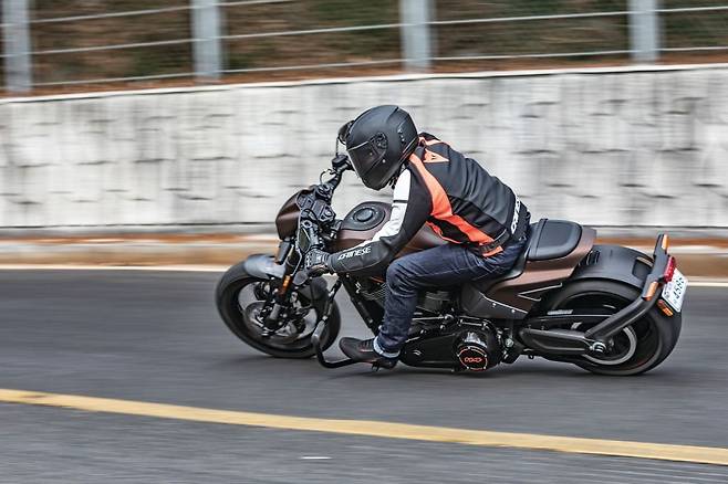 그런데 선회 동작에서 여느 할리데이비슨과 다르게 풋페그에 달린 뱅킹 센서가 쉽게 닿질 않는다. 따라서 자세도 점점 공격적으로 바꾸고 더욱 본격적으로 기울이며 선회를 시도했다. 팔꿈치가 선회 방향으로 빠지고 상체와 시선도 함께 따라간다. 다리를 앞으로 뻗은 탓에 행오프 자세를 취하기에는 불편하지만 바깥쪽 풋페그를 꾸준하게 누르면서 가속하면 엔진의 어느 구간에서도 안정적이며 두터운 그립을 느끼며 돌아나간다. 또한 상체를 숙이는 것만으로도 중심이 낮게 깔려 아스팔트를 짓누르는 느낌을 더한다.