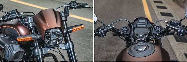 첫인상에서는 긴 휠베이스가 눈에 들어온다. 브레이크 아웃보다 40mm 가량 길다. (브레이크 아웃 1,695mm, FXDR 1,735mm) 리어에 240mm 광폭 타이어를 장착해 박력이 넘친다. 이 때문에 직진성이 강한 바이크고 직진 가속에만 집중한 모델이겠거니 하고 뻔한 예상을 했다. 그런데 의외인 점이 눈에 들어왔다. 기존의 모델들과는 달리 클립온 핸들이 장착된 것이다. 낮고 빠르게 직진하기 위해서 무게중심을 낮추려는 선택일까 하는 의문을 가지고 테스트 주행을 시작했다.