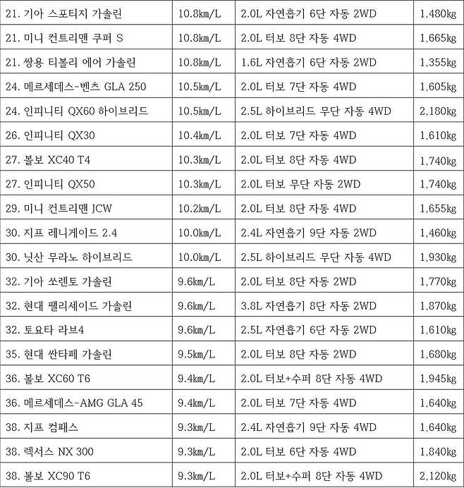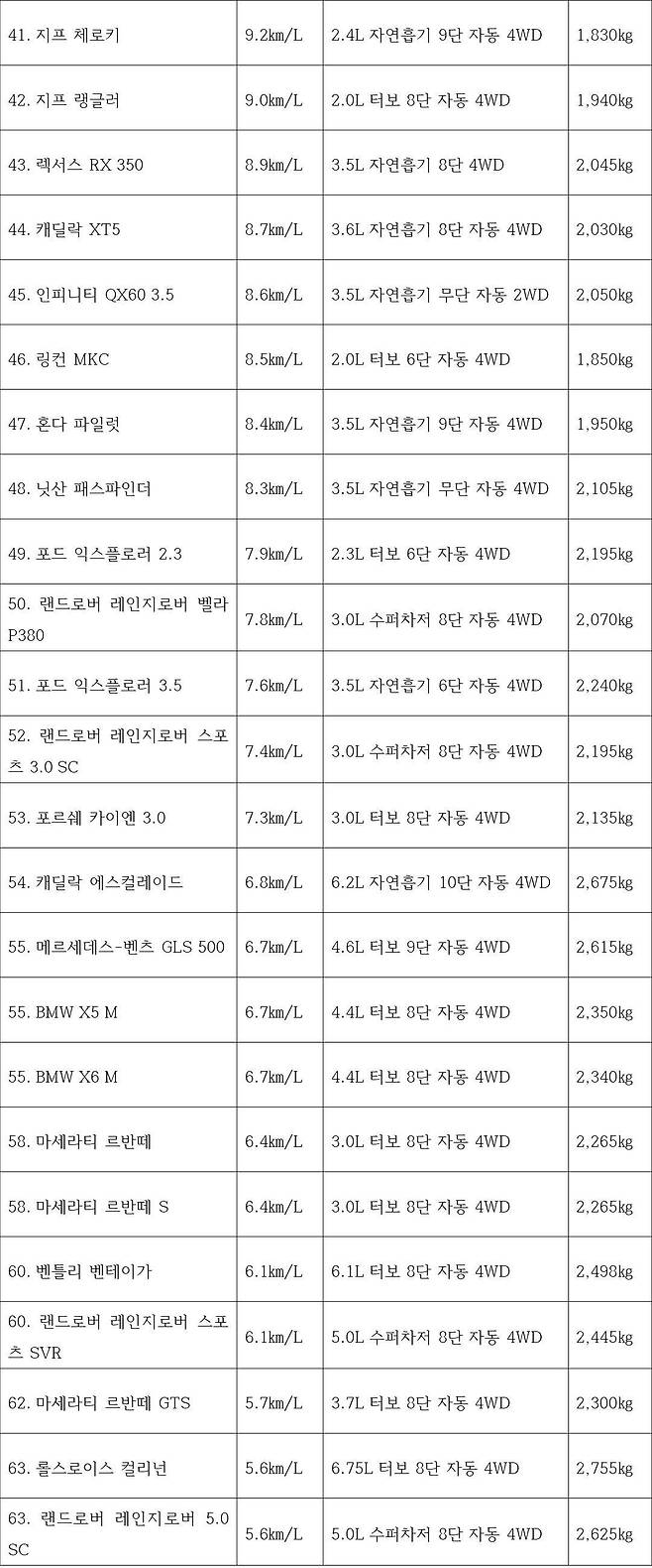 한편, 가솔린 SUV 연비 순위 아래쪽은 거대한 덩치와 넉넉한 배기량으로 여전히 기름을 게걸스럽게 해치운다. 뒤에서 다섯 개 순위를 살펴보면 12기통 터보 엔진을 쓰는 롤스로이스 컬리넌(5.6㎞/L)과 벤틀리 벤테이가(6.1㎞/L)가 자리 잡았고, V8 엔진에 터보 또는 수퍼차저를 더한 마세라티 르반떼 GTS(5.7㎞/L)와 랜드로버 레인지로버 5.0 SC(5.6㎞/L), 랜드로버 레인지로버 스포츠 SVR(6.1㎞/L) 등이 있다.