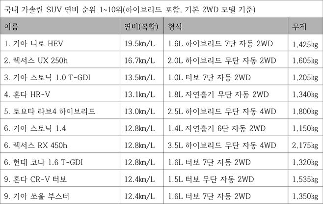 ‘기름 먹는 하마’라고 가솔린 SUV를 부르던 때가 있었다. 프레임 골격과 사륜구동이 당연하던 시절, 무거운 차체를 가솔린 엔진으로 이끌려니 효율이 나쁠 수밖에 없었다. 요즘은 사뭇 다르다. 도시화, 소형화에 이어 하이브리드 파워트레인까지 생겨나 효율이 급격히 올랐다. 오늘날 ‘휘발유만으로 달리는 SUV,’ 즉 전기 충전 필요 없는 하이브리드를 포함한 가솔린 SUV 연비 순위를 살폈다(기본 2WD 모델 기준).