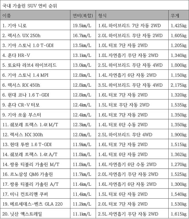 하이브리드를 제외하면 역시 작고 가벼운 소형 SUV가 상위권을 휩쓴다. 3위에 오른 기아 스토닉 1.0 T-GDI를 시작으로 4위 혼다 HR-V, 6위 기아 스토닉 1.4 MPI, 현대 코나 1.6 T-GDI, 그리고 9위 기아 쏘울 부스터가 가솔린 SUV 연비 순위 10위 안에 들었다.