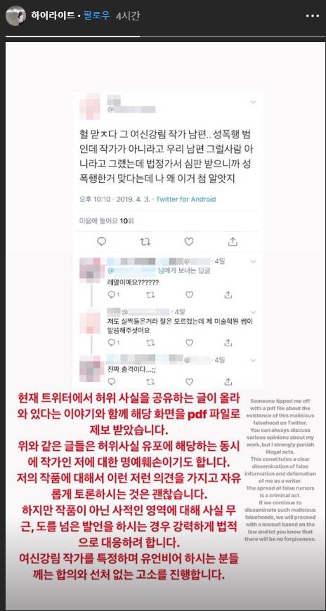 '그 남편이..' 여신강림 작가가 고소한다는 루머 수준