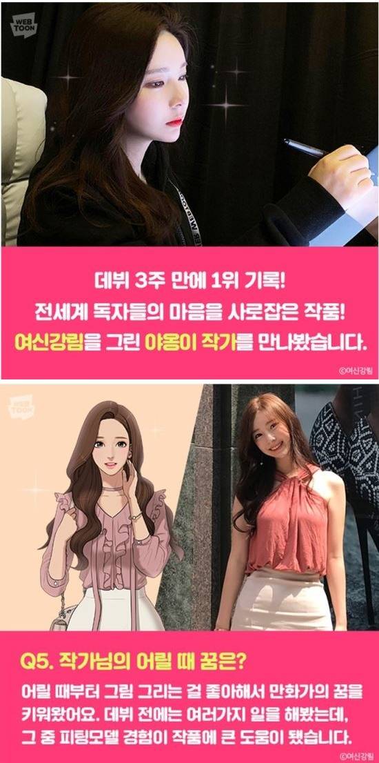 야옹이 작가는 네이버 웹툰에서 여신강림을 연재하고 있다. 지난달 25일 네이버웹툰이 여신강림 1주년 소감 인터뷰와 함께 야옹이 작가의 얼굴을 공개하면서 연예인이라고 해도 믿을 만큼 수려한 외모에 놀랍다는 반응이 이어졌고, 포털사이트 검색어에 야옹이 작가가 올라오는 등 큰 화제를 모았다.